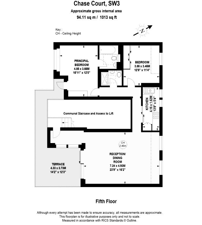 The open-plan living and dining area seamlessly connects to a South-facing terrace, providing breathtaking views of the London skyline. The property also includes a separate kitchen, a south-facing principal bedroom with an ensuite and terrace access, and a secondary bedroom with a shared bathroom for guests.