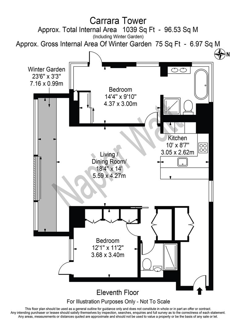 Modern two-bedroom apartment on the eleventh floor of this landmark development designed by world renowned architects Foster & Partners. The apartment is finished to a superb specification, alongside 5* facilities. The property comprises an open plan living room kitchen which leads to a winter garden with fantastic views across London, two double bedrooms with built-in storage and en-suite bathrooms. Carrara Towers has an indoor swimming pool, gym, outdoor yoga and spa facilities. The landlord is willing to purchase new furniture for the apartment (separately negotiable). Images of furnishing are CGI and are for illustrative purposes.