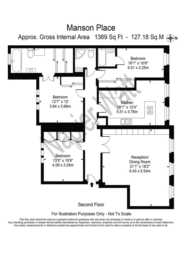 A fantastic three-bedroom, three-bathroom, lateral flat on the second floor (with lift) of this elegant, part-stucco fronted, period building. The flat has been finished to a high standard and boasts generous entertaining space. Laid out over 1,399sqft (124sqm) the accommodation comprises a large living room, modern kitchen, two bedrooms with en-suite bathrooms, a third bedroom and guest shower room. The property further benefits from a separate kitchen.