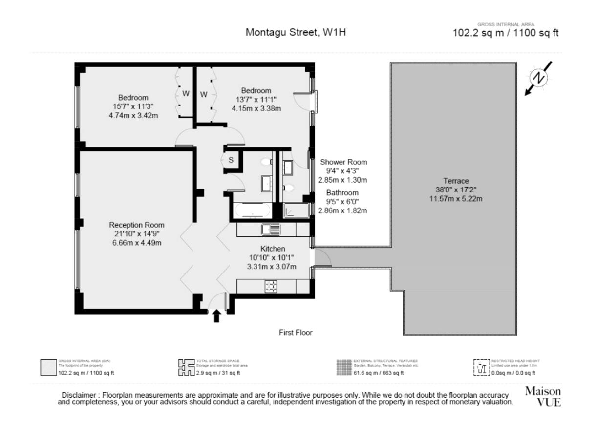 : Entrance Hall : Reception Room : Bespoke Fitted Kitchen : 2 Double Bedrooms : 2 Bathroom : Huge Private Terrace :