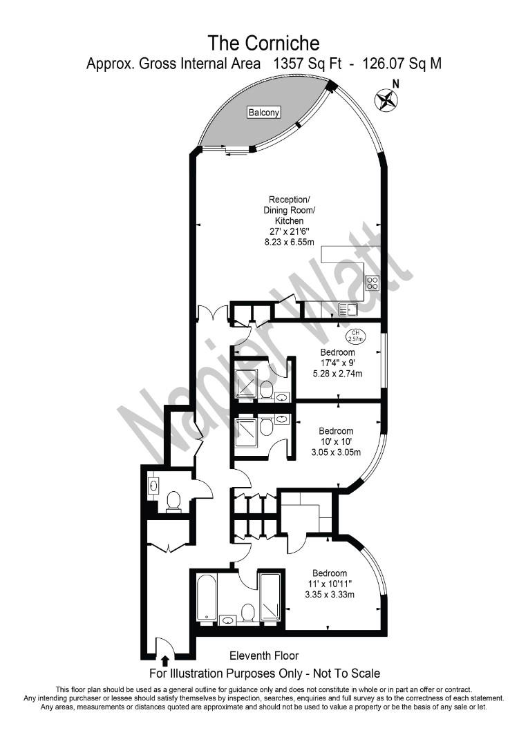 The 1,357 sq ft (126 sq m) property comprises a large open plan reception and kitchen with balcony and views of the River Thames and The Houses of Parliament, three double bedrooms with ample storage, all with en suite bathrooms, and a separate WC and further storage in the hall.